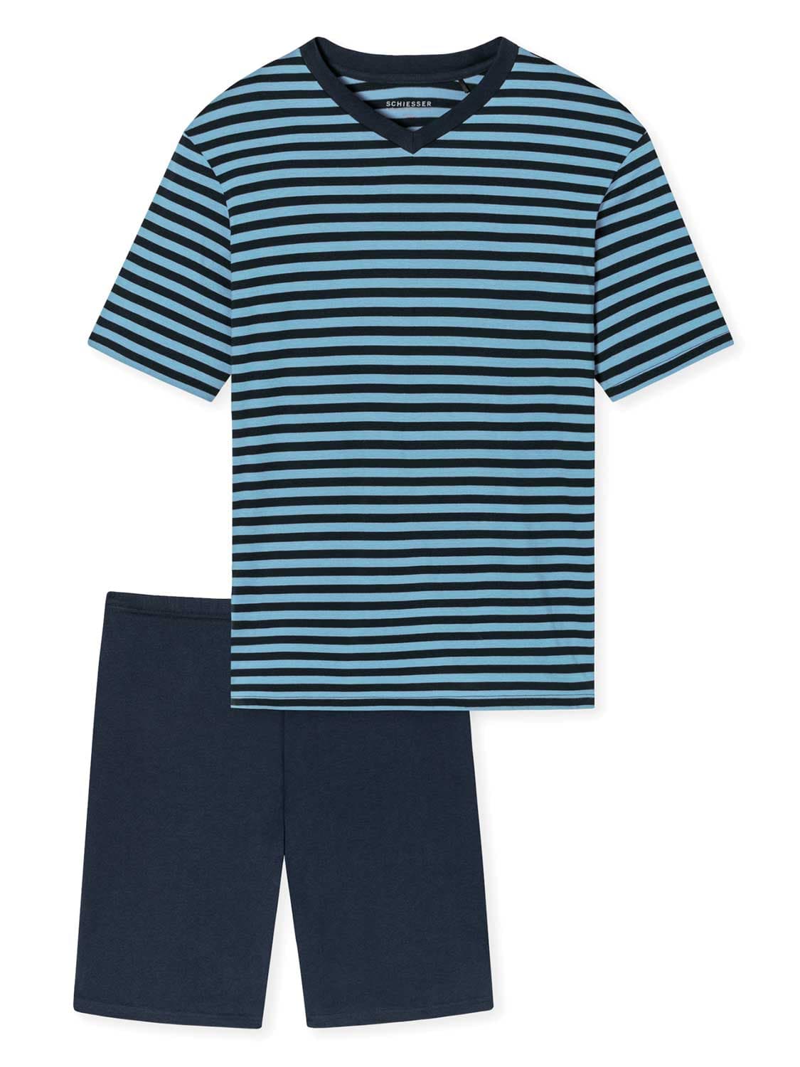 Dette herre pyjamassæt fra Schiesser er lavet af 100% bomuld. Pyjamassættet har ensfarvede shorts og en skjorte med kontraststriber og V-hals. Shortsene er designet med en snor i taljen. Pyjamassættet er løstsiddende og behageligt og kan vaskes ved en temperatur på 60 grader.