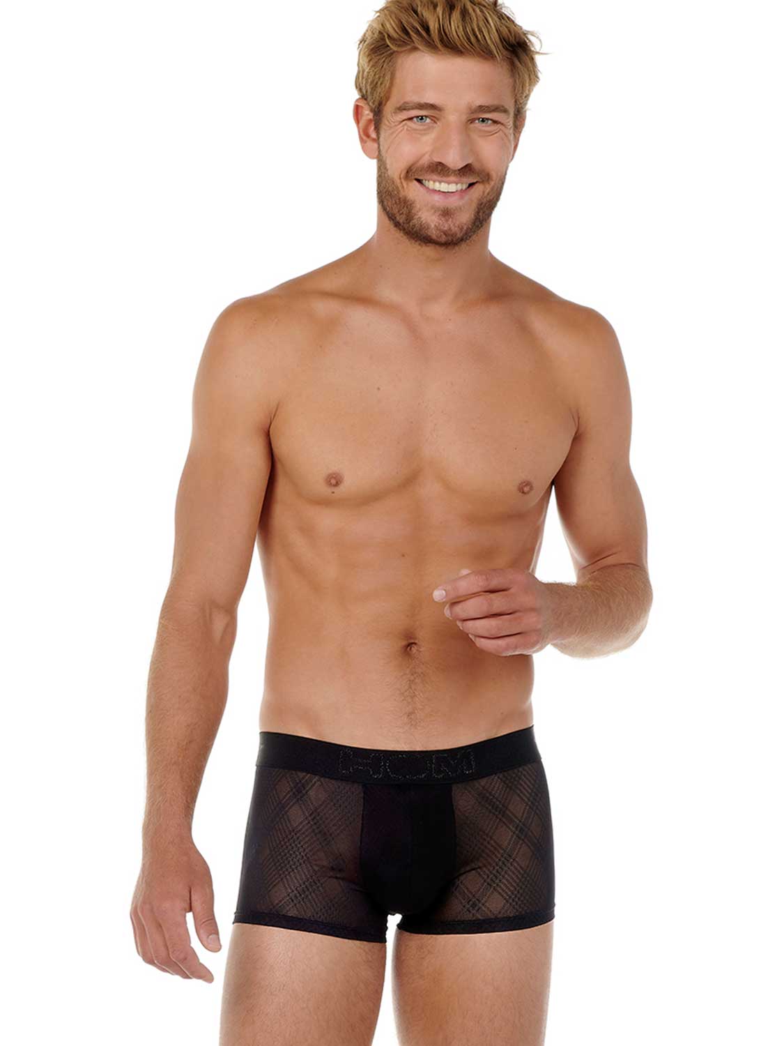 De Kim - Trunk is een sensuele toevoeging aan de HOM Temptation lijn. Dit korte boxershort is gemaakt van een transparante stof met ruitpatroon voor een spannende suggestieve look op de huid. De Temptation serie is voor de man die bekend is met de code der verleiding; uitdagend ondergoed, wat tegelijk chique en elegant blijft. De Kim weet via zijn design perfect met het oog te spelen voor de ultieme verleiding. De pouch is gevoerd zodat deze niet doorschijnt. De trunk heeft een elastische heupband met daarop het HOM logo.