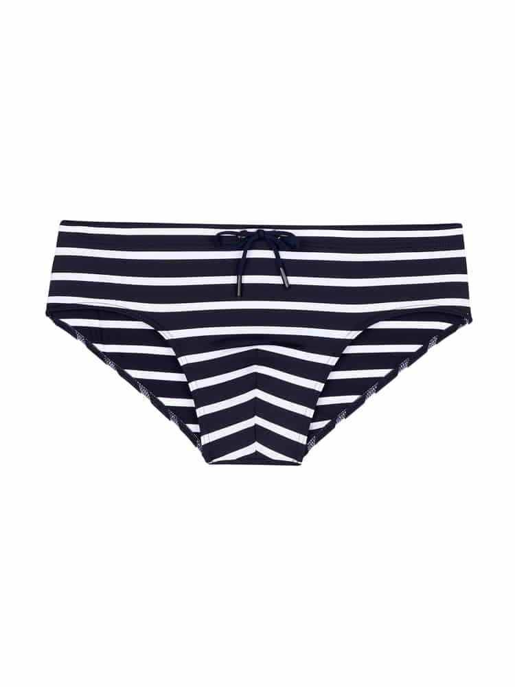De Matias zwembroek uitgevoerd in het mini model. In tegenstelling tot de micro vind je bij de mini het trekkoord aan de buitenzijde. De Matias kenmerkt zich door de horizontale lijnen afwisselend in wit en donkerblauw. Met deze modieuze zwembroek kun je niet mis gaan.