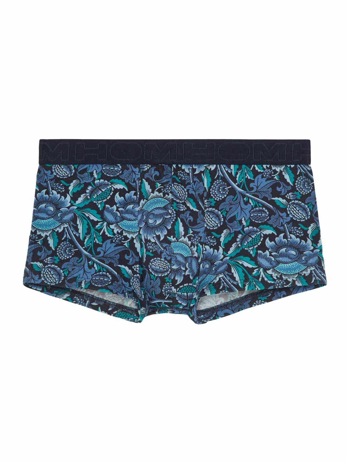 De Paro - Trunk is gemaakt van zacht en comfortabel katoenmodal en uitgevoerd met een fleurige print in de kleur blauw met aqua op een marine kleurige achtergrond. Katoen modal is geschikt voor de man die graag natuurlijke stoffen draagt. Daarnaast ademt katoenmodal goed waardoor je minder last hebt van zweetplekken of onaangename geurtjes. De Paro trunk is kort uitgevoerd met een moderne snit en daarmee een plezier voor het oog voor iedere modebewuste man. De brede tailleband is uitgevoerd in marine blauw met het HOM logo in ton sur ton.
